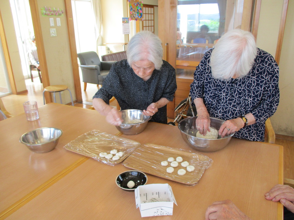 今回は、ぜんざいです。お年寄りさんと一緒に白玉団子を丸めるところから始めました。