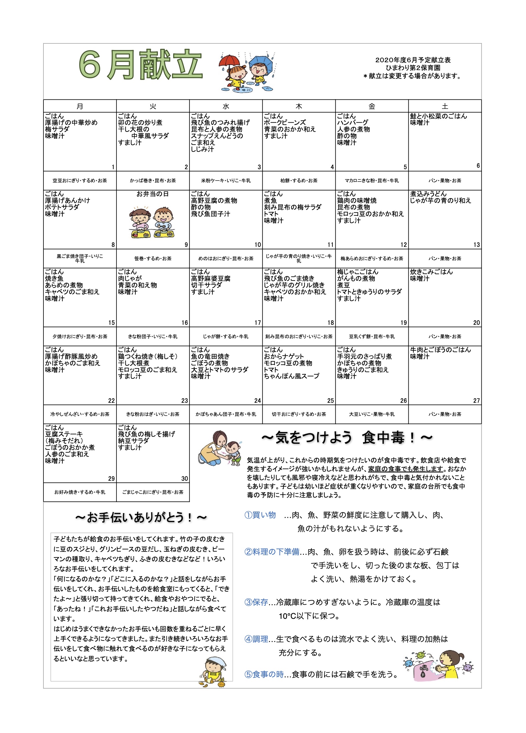 ひまわり第2保育園 R2年6月献立表