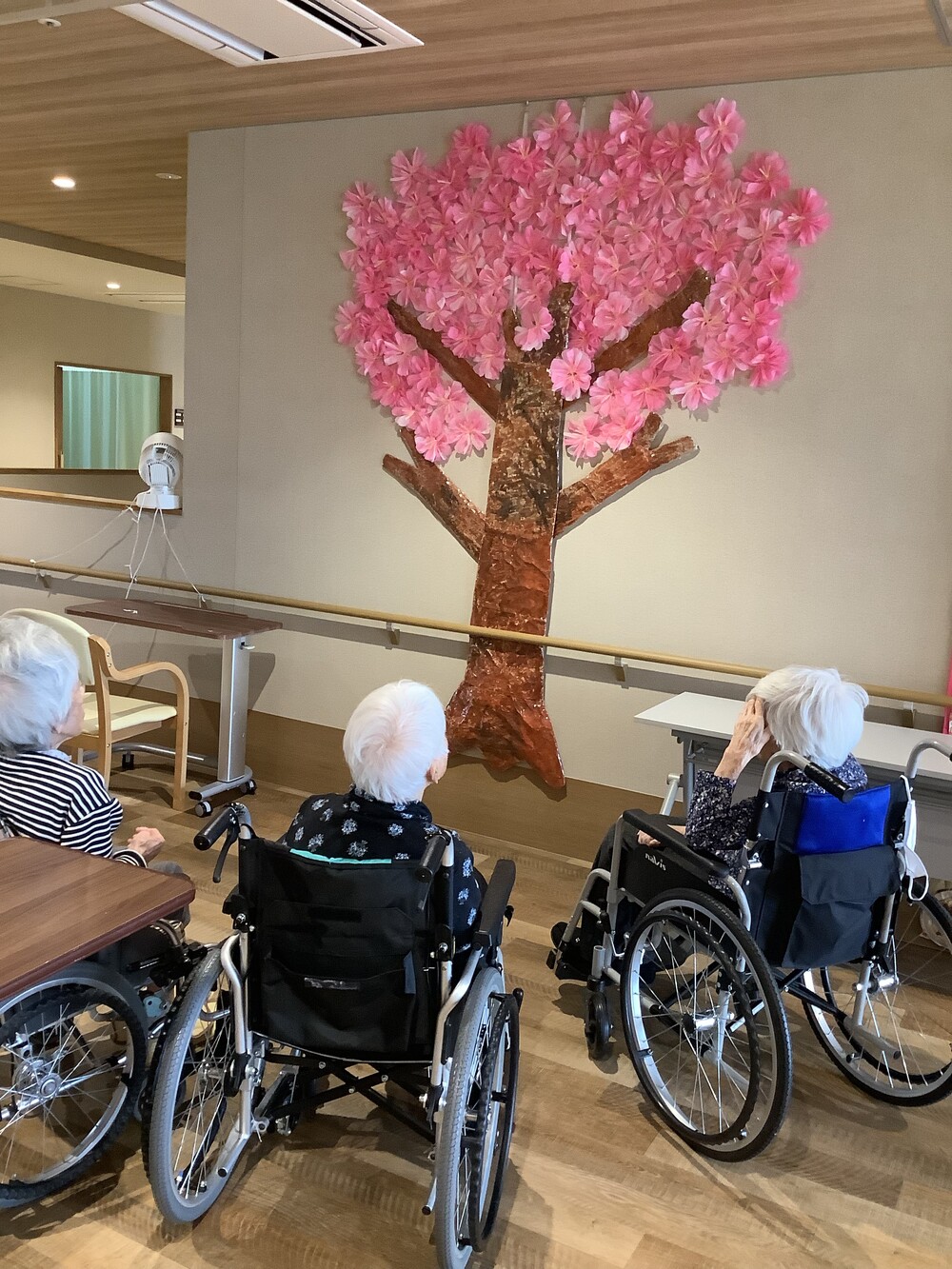 早速、壁に出来上がった木を吊り下げて、次に桜の花を咲かせていきましょう。